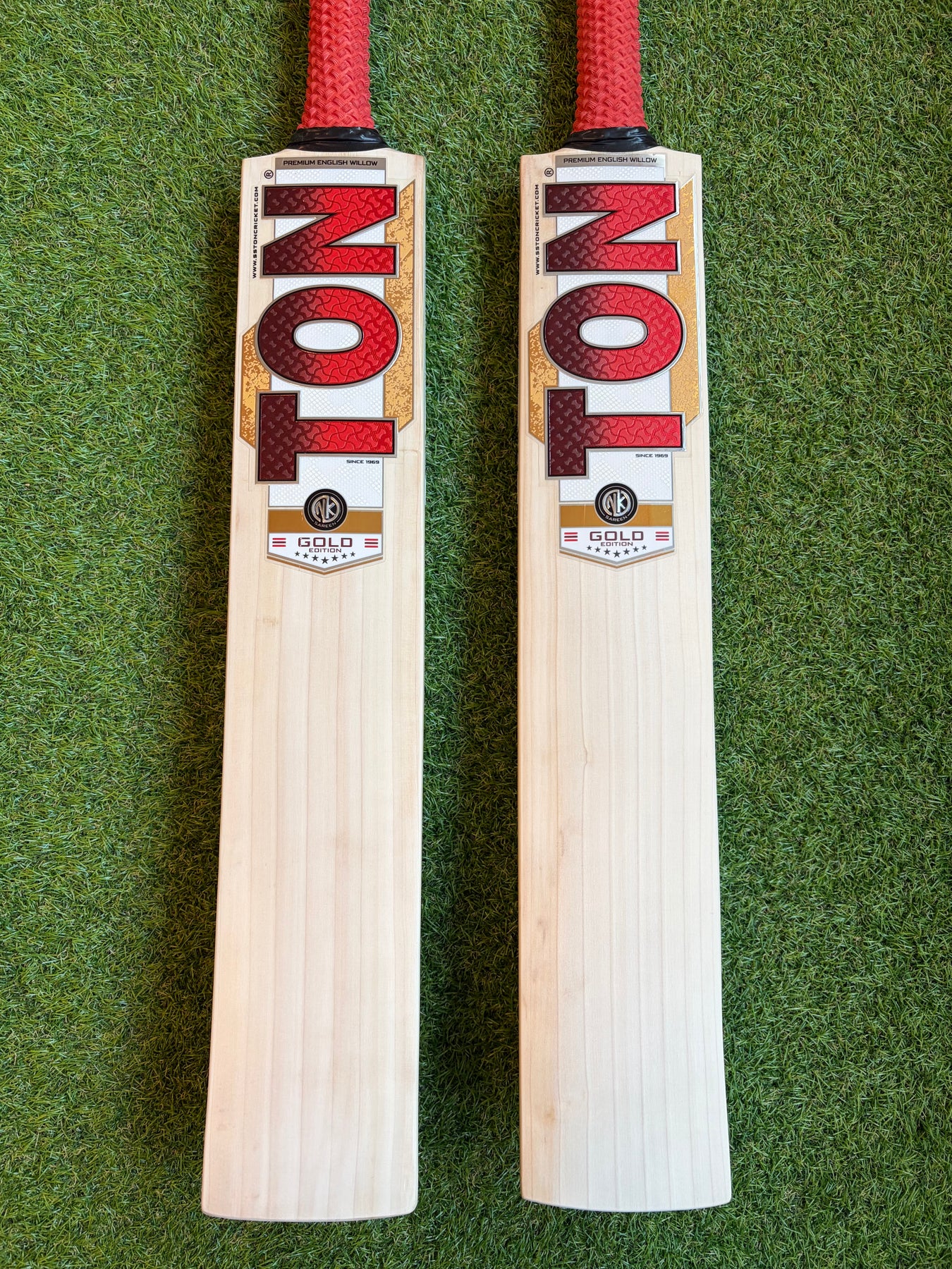 The stunning TON Gold edition cricket bat is made from Grade 1 english willow with 8 straight grains on a white clear face. on Bat A. Bat A has a full duckbill profile with 38mm edges and 2lb 9oz in weight.